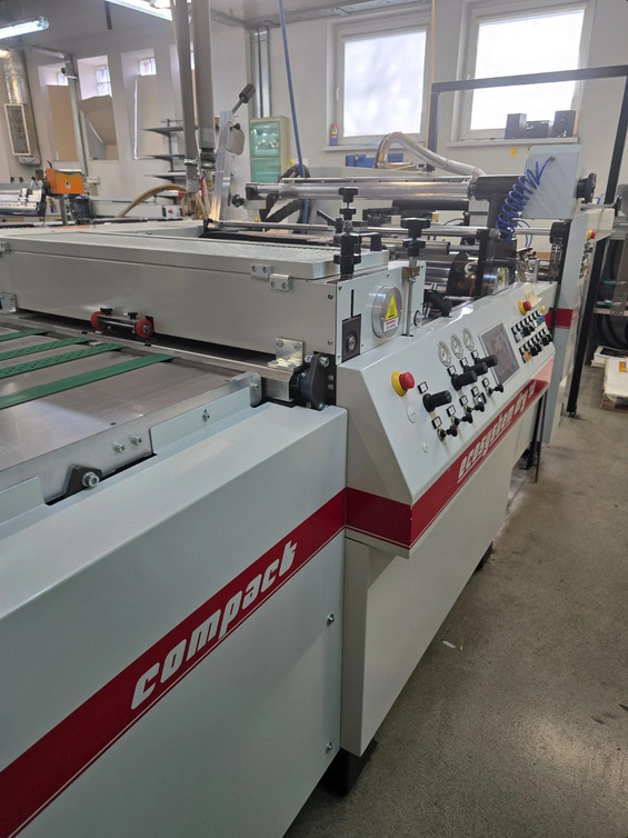 Automatic sheet feeder with suction table<>Laminating unit with chrome-plated heated calender <>External water heater unit with pressure system<>Sheet separation group <>Hot knife system with Scatec laser correction <>Automatic stacker