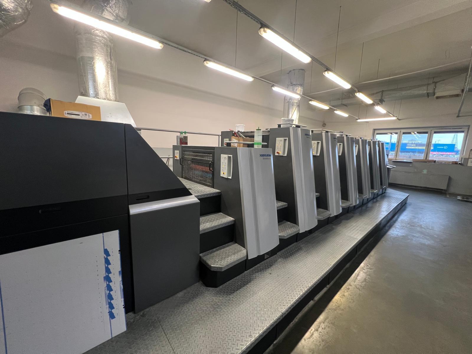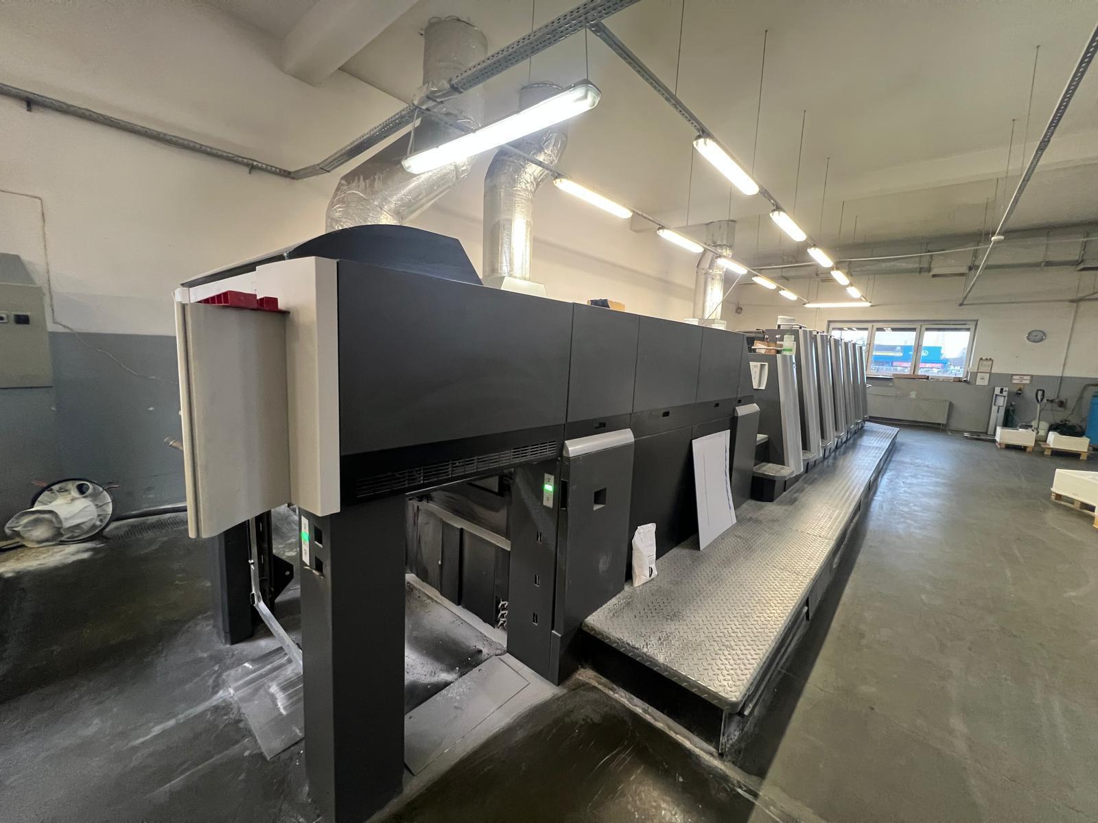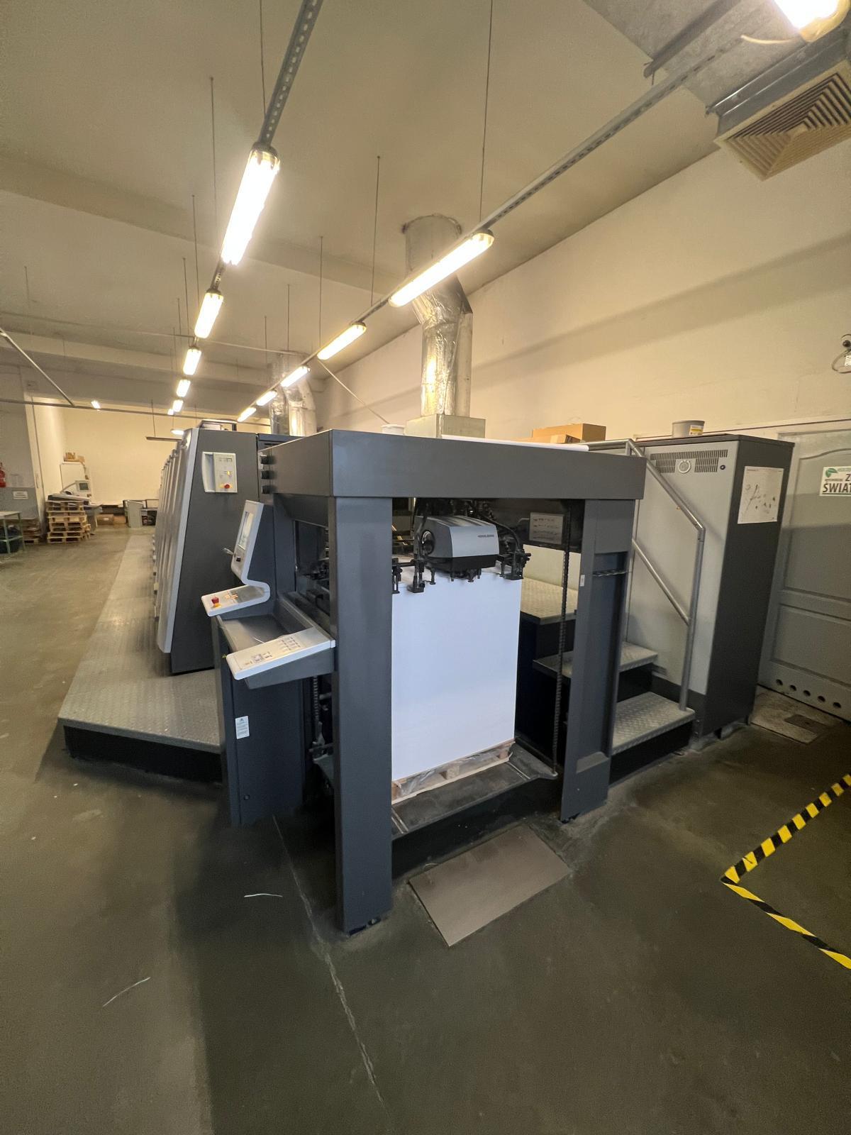 USA Format (F): 605 × 750 mm<>Prinect Press Center XL2<>Inpress Control<>IntelliStart <>Autoplate<>Preset Plus Feeder<>Preset Plus Delivery X2<>Ultrasonic double-sheet detection<>Automatic presetting of all air and sheet-guiding values<>Airtransfer System between units (Venturi effect) for contact-free sheet transport<>Automatic washing systems: blanket washers/ impression cylinder washers/ inking roller washing program<>AutoPlate: Fast semi-automatic plate change<>16-roller inking unit with 4 form rollers<>Ink roller adjustment assistant<>Alcolor dampening system<>Alcolor-Vario<>CombiStar CANopen<>Precise dosing and measurement of alcohol amount AlcoSmart,<>Coater with Chambered doctor blade system<>Intelligent water/ink balance control<>Hexagonal anilox roller<>Pomp LVG 550<>Drying system: DryStar Combination (IR + hot air)<>DryStar Combination CANopen <>(IR + hot air + ambient air)<>Non-stop delivery operation with “board system” - manual<>Dynamic sheet brakes for smooth deceleration at high speed<>PowderStar AP 262 CAN<>System CleanStar<>StaticStar Compact