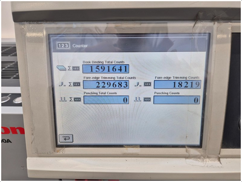 | Description: | Mod. Vac-100A+Vac-100M<>Air suction collator<>FC-200A fore-edge trimmer<>Front cutter FC-200A<>Horizon PK-30 Preset Kicker<>IF-200 infeed unit<>LC-200 Long Conveyor |
