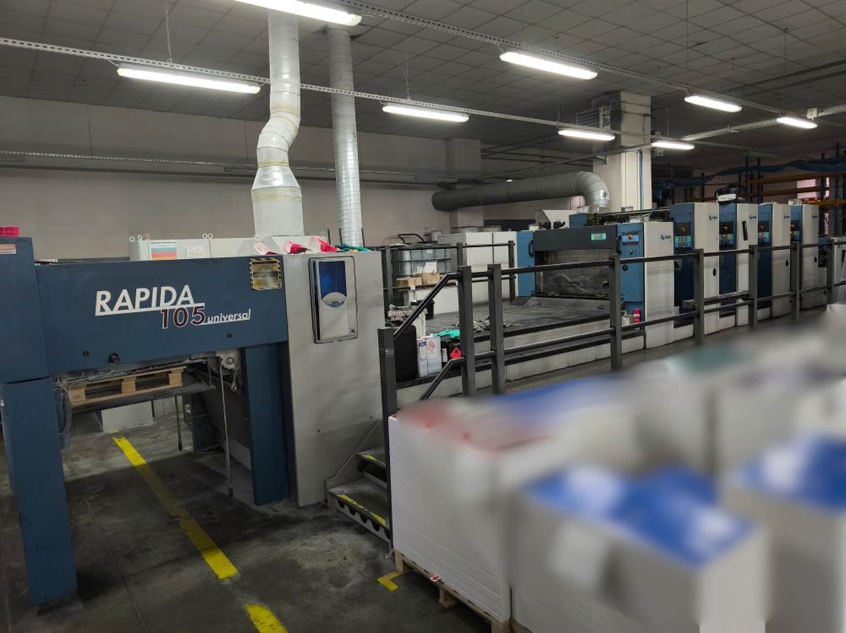 Mod. RA105-4+L CX Universal,<>manual plate<>auto register<>KBA RapidDry<>Non-stop feeder<>Straight machine<>Automatic wash-up device<>Coater