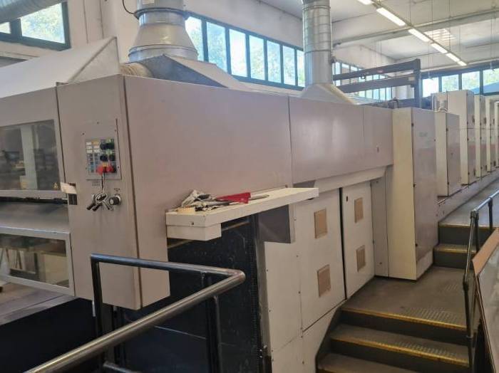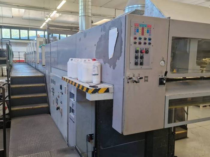 | Description: | Technotrans Combi cooling for ink and damping, <>Coating units with Tresu doctor blade after 6th units with feeding/cleaning system for conventional coat, <>Grafix Hitroinic S Spray powder, <>IR-Hot Air Eltosch dryers on delivery, <>Machine elevated on plint 60 cm., <>Osmosis water treatment, <>Techon inline, reserve rollers, <>1 spare anilox,<>RCI Ink Control Remote<>PPL Power Plate Loading (semi-automatic)<>Double-sheet control<>Blanket + Roller wash-up device<>Extended Delivery<>Non-stop feeder and delivery<>Color Pilot densitometry and spectrophotometric measurement device<>Plate punch |