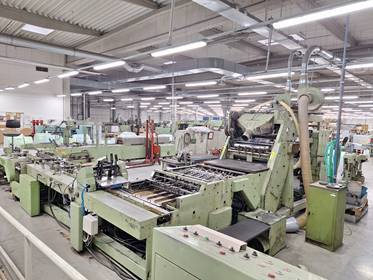 Semi-automatic line producing replacement inserts for ring binders in formats<>A/4,5,6 with a number of sheets of 10-100 with different rulings and soft or semi-rigid backing.<>Input raw materials, paper weight 60 g/m2 in rolls with a width of 600-650mm, printing inks,<>backing in sheets and packaging foil.<>The resulting product is individually or in groups packed and placed on a pallet