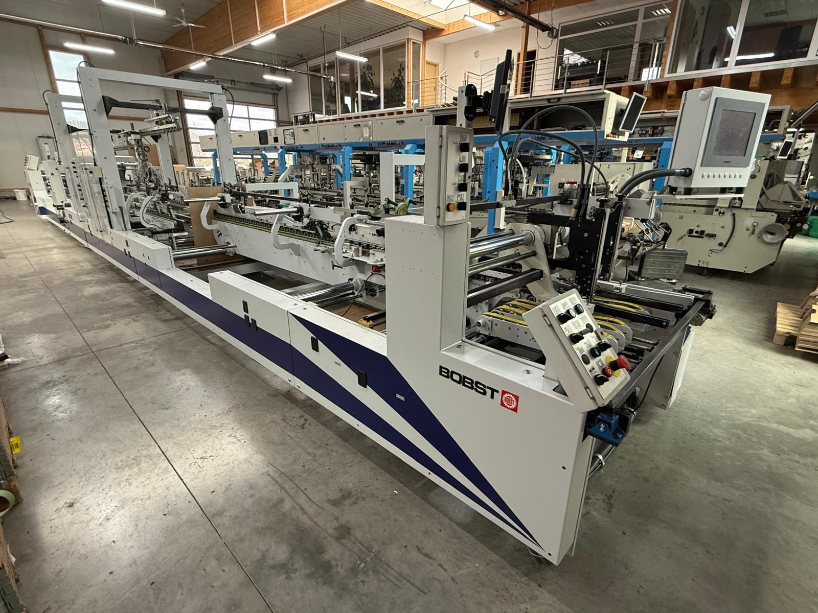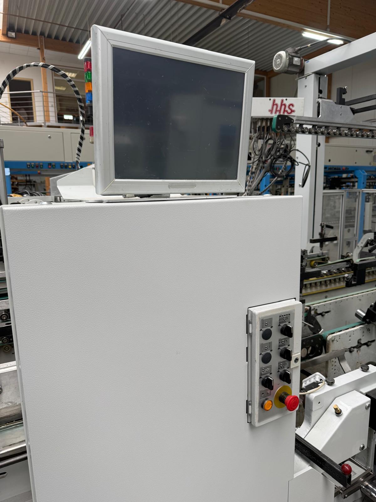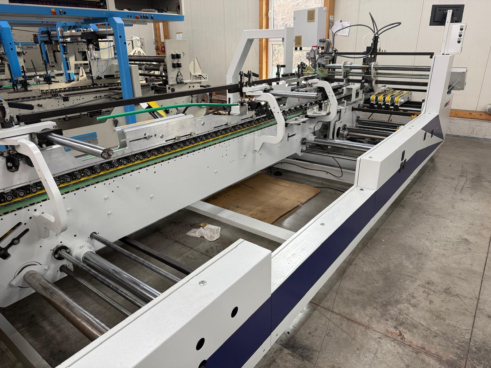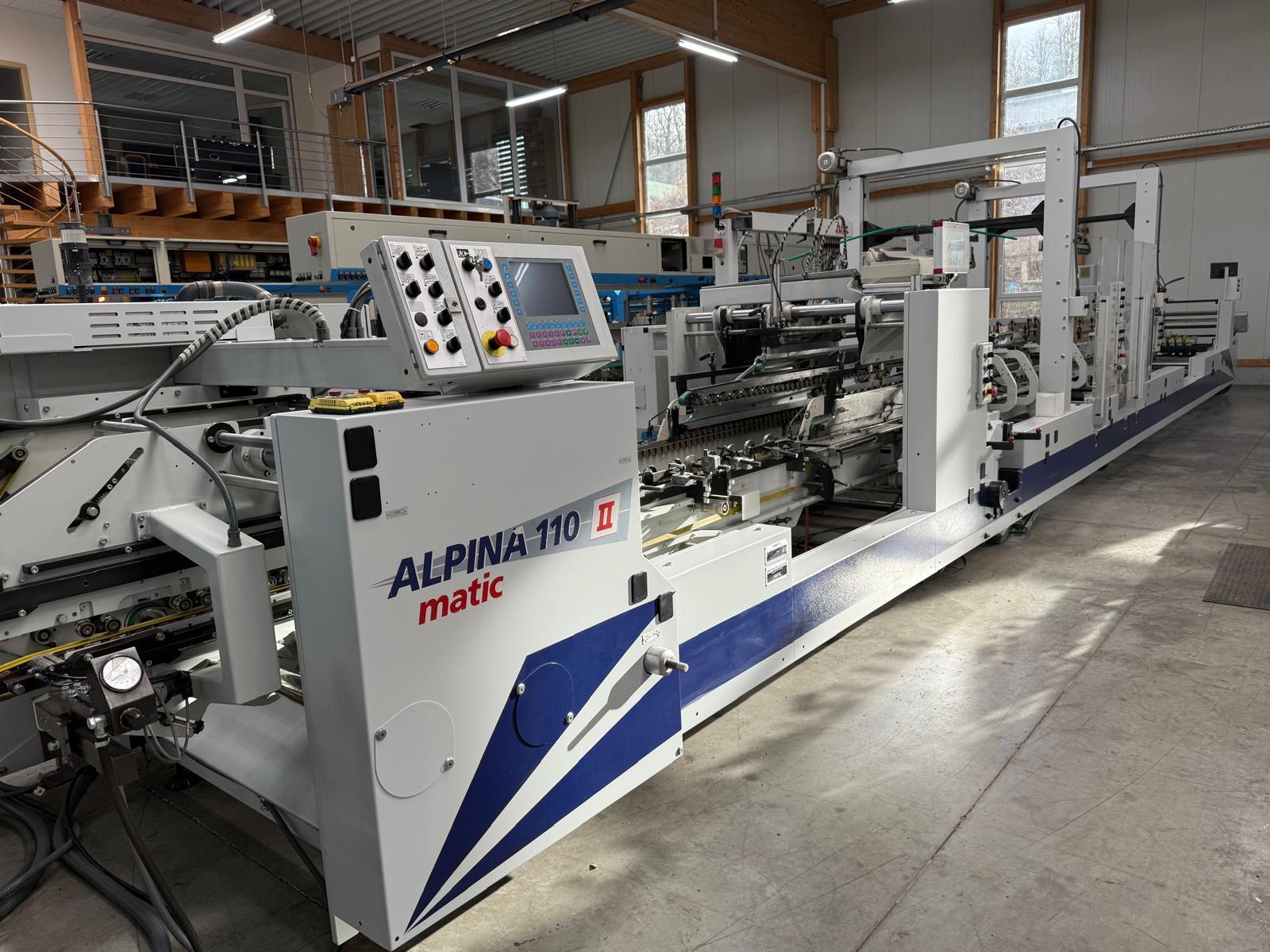 Mod. Alpina 110 II A3 Matic<>electronic upper gluing system HHS X-tend, <>8 channel with 6 guns, <>equipped with additional modules for quality control: code reader and disc glue with flipper control , <>lower disc gluing station left, <>feeder with vibrator, <>tooth gauge and vacuum, <>aligning section right & left after feeder, <>pre break module with central transport, <>electronic servo back folding with program memory, <>remote control, <>digital read out units, <>motorized size adjustment, <>full automatic box memory system Matic, <>central transport in pre breaker and folding, <>2 x motorized height adjustable tool holder, <>press device after folding, <>kicker, <>video control in transfer station, <>2 x box squaring unit at press station, <>extended press station<>Reconditioning 2026: cleaned, checked, new feeder and transport belts.<>StraightLine<>Lock-bottom<>Double wall<>4 + 6 point glue system<>Counter