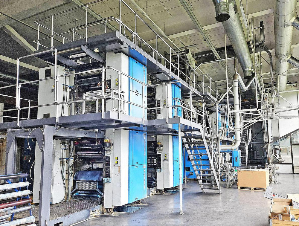 | Description: | 6 x reel-splicers AMAL AR-60C<>Jimek spray dampening<>Honeywell print controls<>1 x Folder for 1/4 fold<>with online Tolerans stitcher<>upper former<>All necessary motors, drives,<>Plate bender |