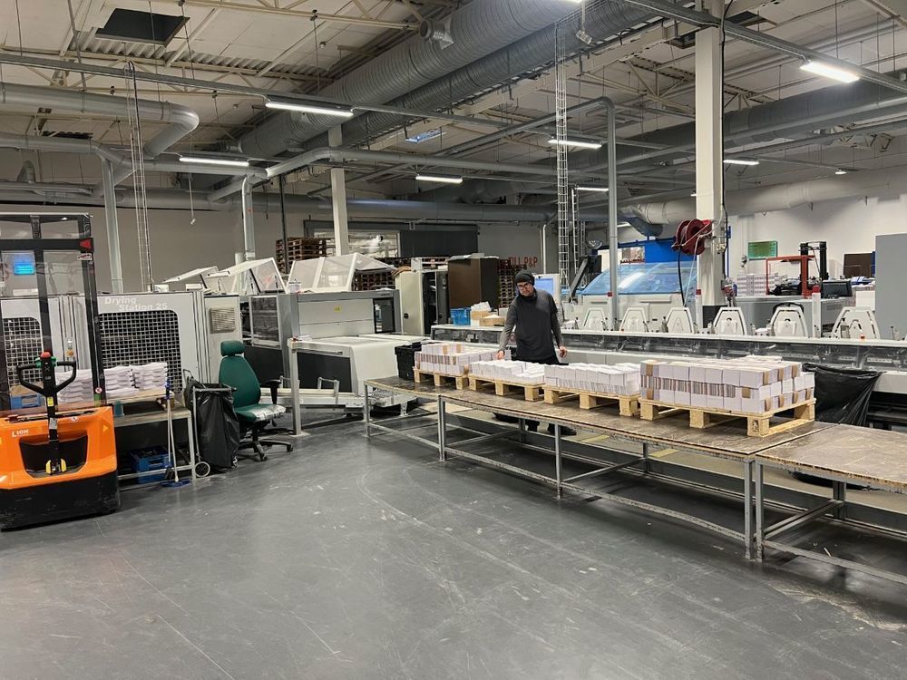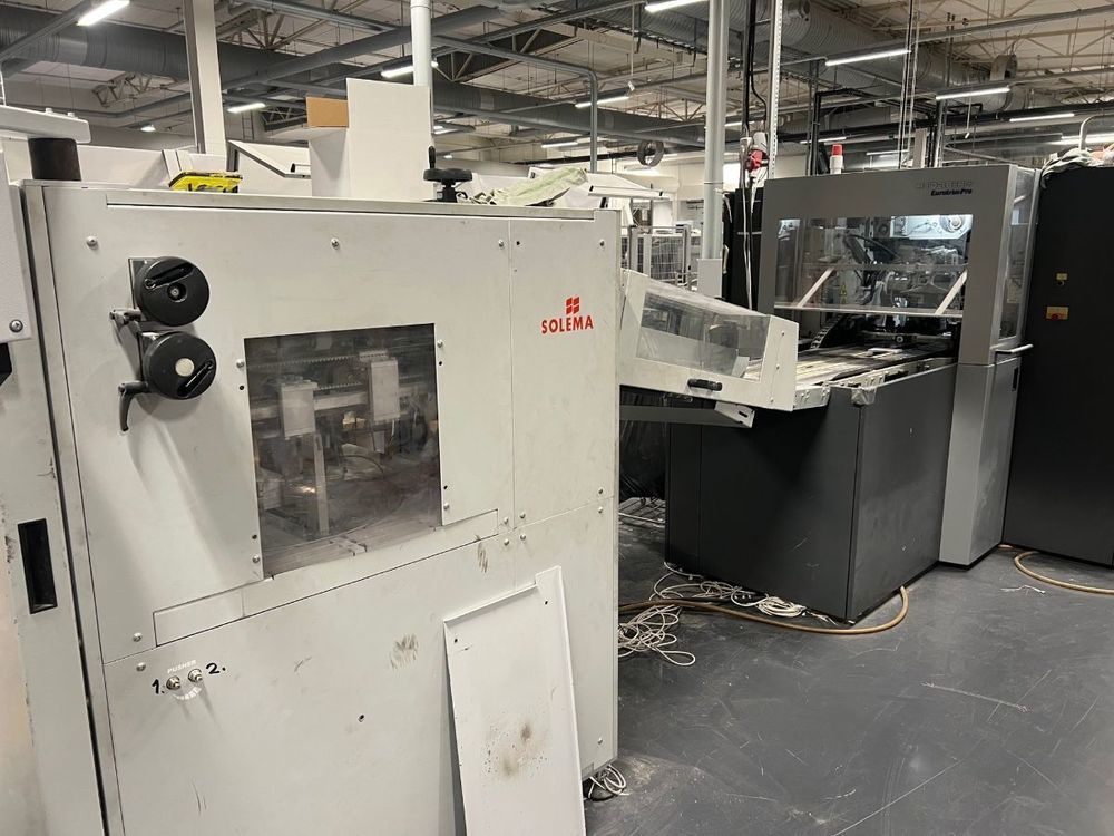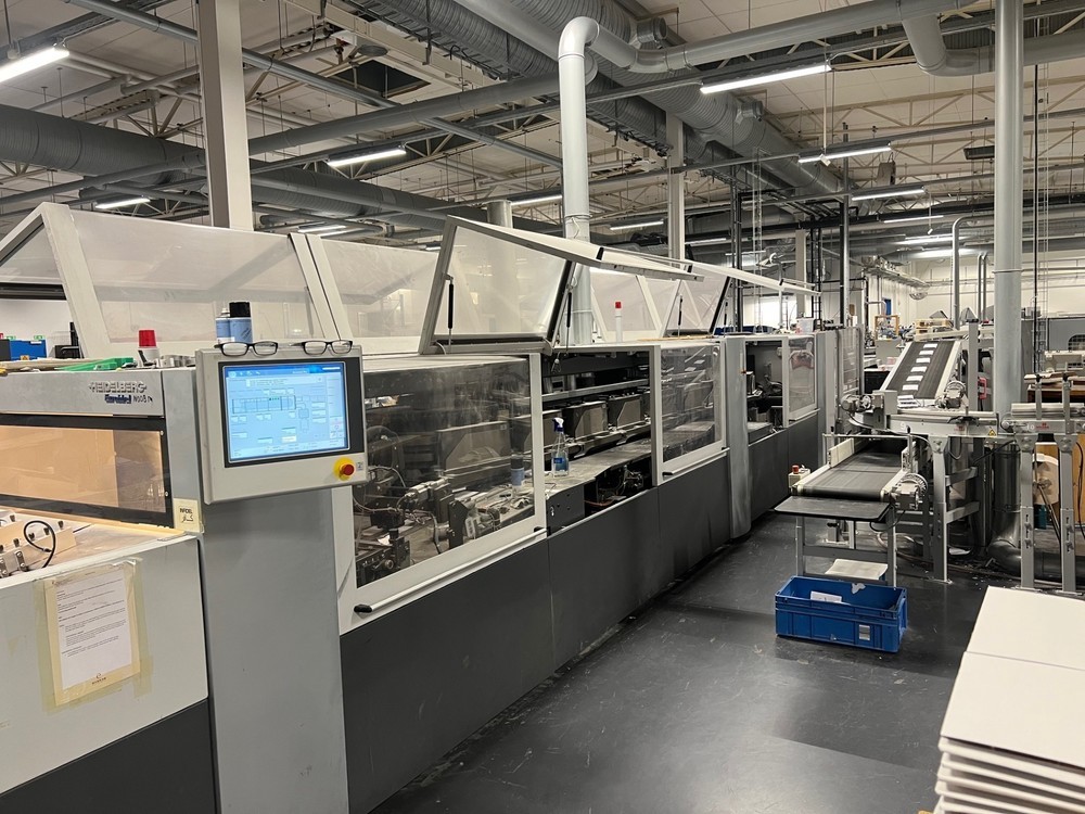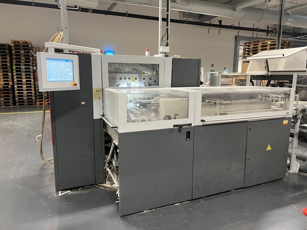 | Description: | Gathering Machine HFM EG 804.L/<>- 8000 cycles/h<>- OSC-system (OPTICONTROL-system) for all 12 stations<>- ATC (automatic section thickness control)<>- Hand feeding unit at beginning <>- Pile lifter with air blast<>- Stand-up-unit<>- Transfer channel with jogging-station as connecting-unit to the binder<>-spine preparation<>- 2 premelters<>- PUR premelter<>- cover pressing station<>- 2nd S cover pressing station<>- lay down device<>- Documentation<>Continuation of Equipment:<>Conveying- and Cooling/Drying System - ca. 20 Metres<>- drying tower Solema<>- With redirection systems<>- Extra delivery (exit) before 3-knife trimmer<>- Control-cabinet<>High Performance 3-Knife Trimmer EUROTRIM PRO <>- Infeed from the right<>- Counter stacker (pre stacker) integrated<>- Spraying device<>- Prepared for a trim-waste extraction system<>- Plenty exchangeable cutting-tables<>- Belt-delivery<>- Knife changing device<>- Several extra Sets of knifes,<>- Electric cabinet<>- Extra knife-adjusting system<>- Accessories, parts<>- Documentation<>Compensating Stacker SOLEMA<>- Delivery<>- Documentation<>Hotmelt spine + side gluing<>Milling and roughening station<>PUR spine gluing |