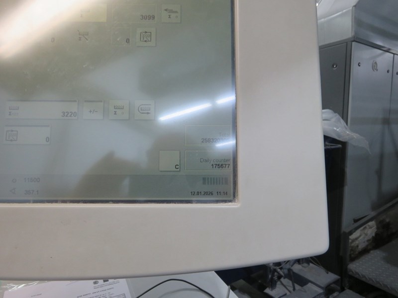 | Description: | Prinect Press Center<>IR / TL dryer Heidelberg DryStar<>Air-cooled machine<>Alcolor automatic Film Dampening<>Autoplate advanced<>All washing devices<>CIP -3 Pre-press interface Job memory card drive<>Preset Plus in feeder and delivery<>Antistatic device StaticStar<>Weko AP500 Powder Spray<>ITC Ink temperature control<>TECHNOTRANS cooling<>AlcoSmart alkohol metering<>Clean CleanStar powder sucker<>AirStar, Air cabinet water-cooled |
