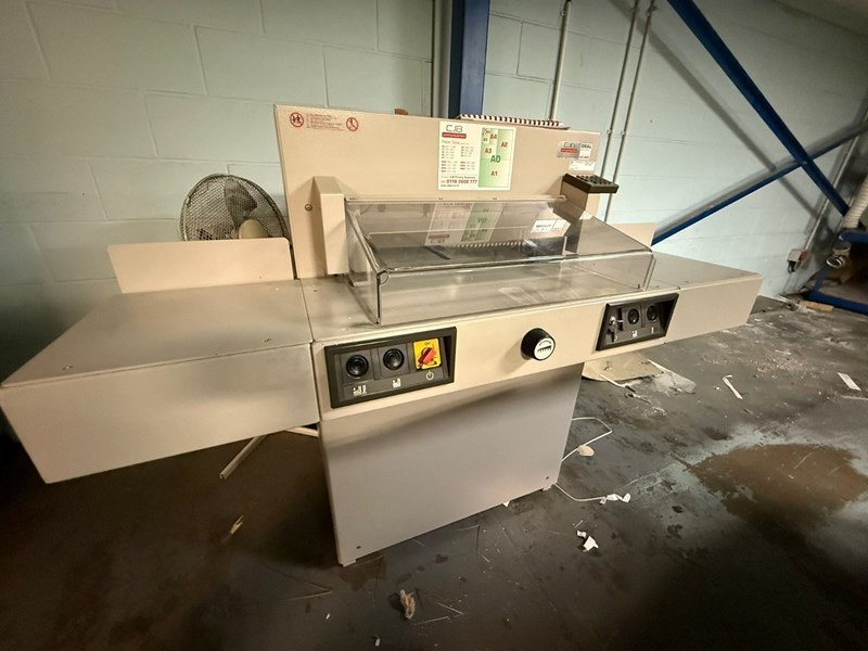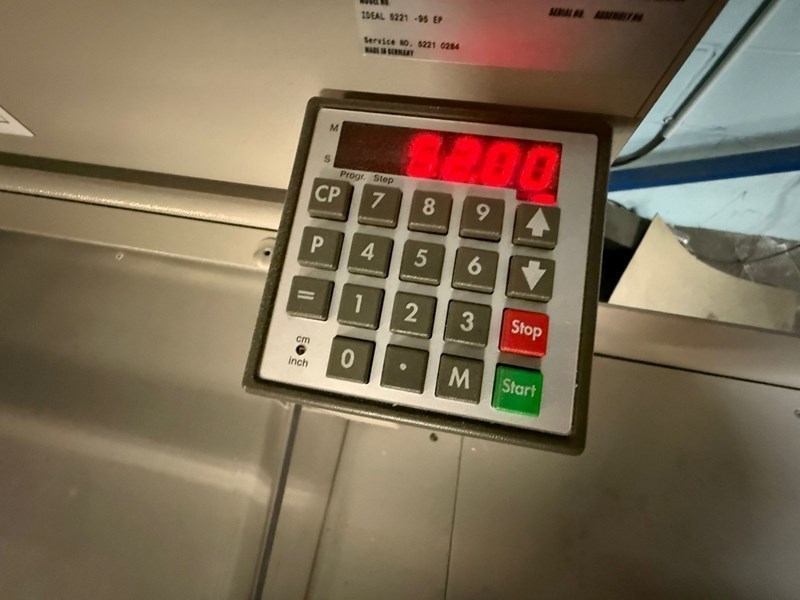 | Description: | Mod. 5221 95 EP<>Electro-mechanical blade and clamp drive<>Power ‘EP’ back gauge<>Control module<>Electronic hand wheel for manual back gauge positioning<>Infinitely variable speed control (from very slow to very fast)<>Optical cutting line<>Adjustable back gauge with narrow separations and plastic gliders<>Two side lays each on front and rear tables<>High-quality blade made from “Solingen steel”<>Solid steel blade carrier and adjustable blade guides<>Automatic clamping system, guided on both sides for evenly distributed clamping pressure<>Clamp can be lowered or raised independently from blade<>Machine and stand can be separated for transportation through narrow doors (70 cm)<>Side tables (left and right)<>SCS (Safety Cutting System): hinged, electronically controlled safety guard on the front table<>Transparent safety cover on the rear table<>Main switch and safety lock with key<>Electronically controlled true two-hand operation<>24V controls (low voltage)<>Disk brake for instant blade stop<>Blade changing device with covered cutting edge<>Blade depth adjustment from the outside of the machine<>Easy blade change from the front of the machine without removing covers.<>Digital display for measurement readout in cm or inches (display accurate to 1/10 mm or 1/100 inch)<>10-button keypad for presetting of measurement<>Memory key for repeat cuts | 9 programs with 9 steps in each program (up to 9 repeat cuts can be integrated into a program as one single program step)<>Setting of program steps via “Start” button<>‘SET’ function key for reference measurement<>Programmable eject function – for pushing out the paper<>Two programmable keys for quick setting of frequently needed measurements<>Self-diagnosis system with error indication on display |