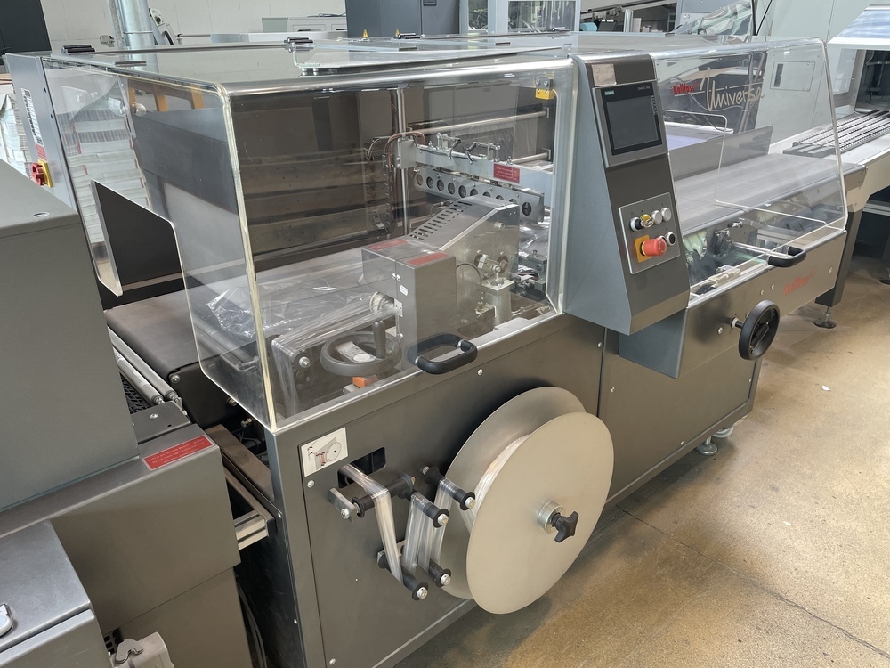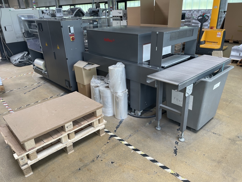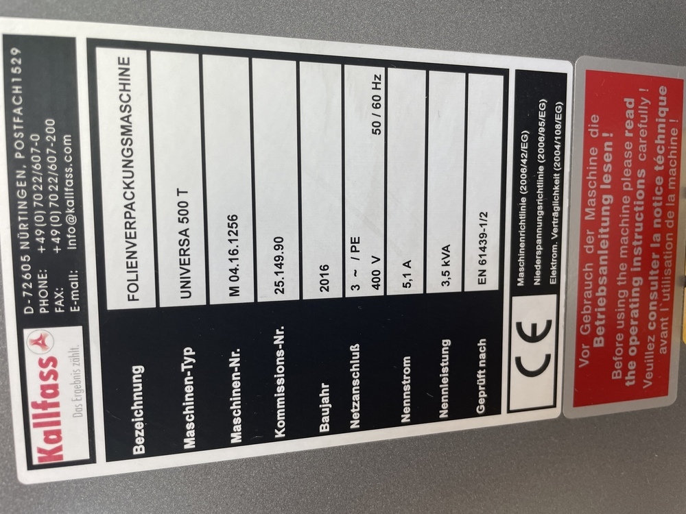 Description: KALLFASS fully-automatic Side Sealer Universa 500T<>Technical data:<>Cross seal bar, length - 500mm<>Product clearance height - 200mm<>Power supply - 208 -480 Volt<>Film, center-foldedfilm - 12 - 80 <>Transport speed - 10 - 35 meter / minute<>Packaging speed, max. - 85 cycles / minute<>Power connection: 400 V three-phase current, 50/60 Hz with protective conductor<>Rated power: 3,5 kVA<>Rated current at 400 V: 5,1 A<>KALLFASS Shrink Tunnel Compact 650 S<>Technical data:<>Adjustable working height - 800 - 900mm<>Tunnel clearance width, height - 650mm, 200/400mm<>Length of the heated tunnel hood - 1200mm<>Power supply - 280 - 40 Volt<>Continuously adjustable temperature - bis 190 C<>Transport speed - 5- 17,5 meter / minute<>Installed heating capacity - 13,5 kW <>Power connection: 400 V three-phase current, 50/60 Hz with protective conductor<>Rated power: 14,5 kVA - 11,1 kVA<>Rated current at 400 V: 20,9 A + 16,0 A<>Perfect for fully automatic film packaging, this system offers proven technology at excellent value. Manufacturing companies with a broad product range, industrial services companies, and contract packaging companies benefit greatly fromm the efficient production processes and simple handling of the robust, reliable film packaging system. <>The compact shrink tunnel for small to medium formats. With the extra advantage of heat performance.