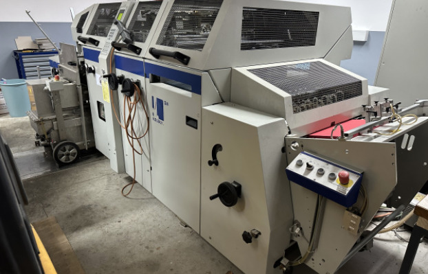 board magazine for manual loading<>centre strip infeed for the spine strip<>cloth feeder with pile magazine<>counter stacker delivery with following roller conveyor<>corner cutter<>viscosity control device