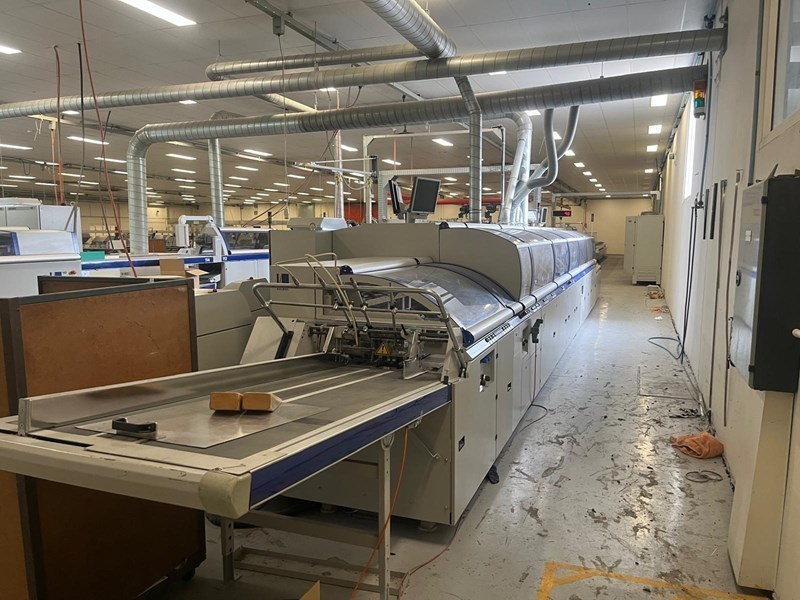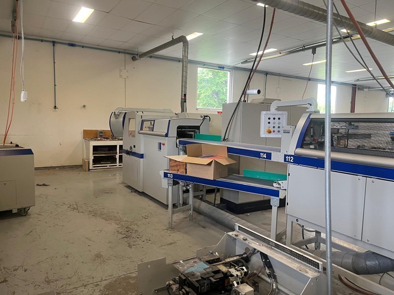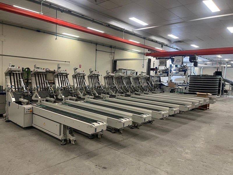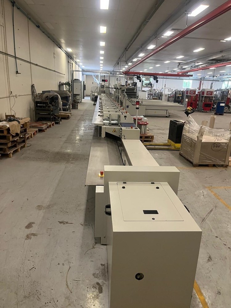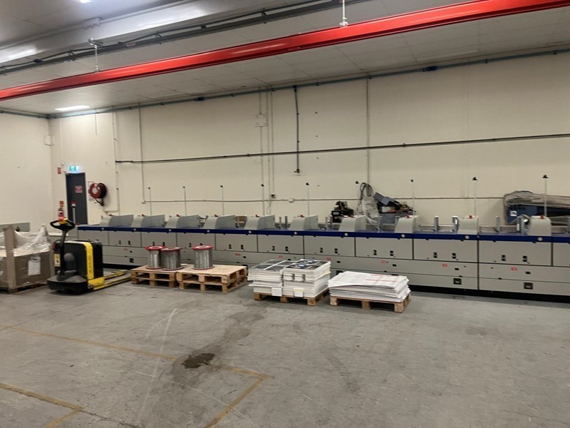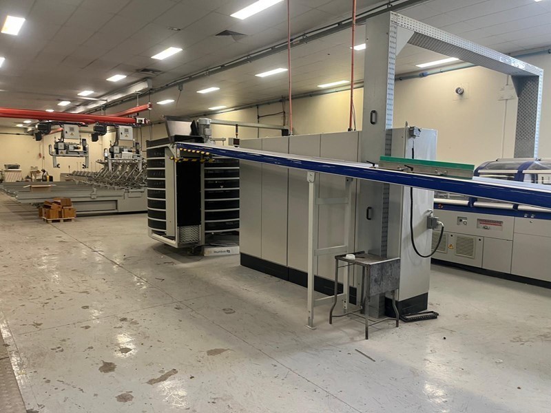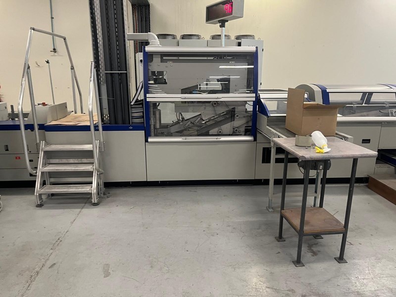 | Description: | Becker ‘Air Center’ vacuum unit<>10 x STA stream feeders with log extensions<>21 x ZU841 interchangeable top-loading feeders, standard 3 x 5mm max. thickness<>Mechanical & electrical de-coupling of each station possible<>Optoelectronic signature recognition system<>‘Cascade’ control for automatic starting and finishing of a complete book<>‘ATC’ Automatic thickness control for mis/double feed detection<>AS 841 reject station for over or incomplete books with length & width monitoring<>Raceway/transfer with vibrate unit<>Milling/brushing, equalizing milling, ‘Micro’ notching & brushing units<>Gluing system comprising;<>LH 375.C floor standing EVA hot-melt pre-melt unit<>Nordson PUR spine gluing system<>EVA hot-melt spine glue tank with cam-controlled cut-off<>Hot-melt spine glue application<>Hot-melt side glue unit<>I.R. heating in radius for increased glue open time<>Cover nipping/pressing station<>2nd nipping/pressing station<>Delivery system with lay-down device and reject station<>‘AmbaFlex’ XAF 661 tower + TS.Z conveyor system (details on request) to;<>Kolbus HD153.P pile trimmer with ‘Co-Pilot’ pre-setting<>Rima/Kolbus XKL 500 compensating book stacker<>Including spares, manuals & Kolbus 3.60 remote internet link & back-up. |