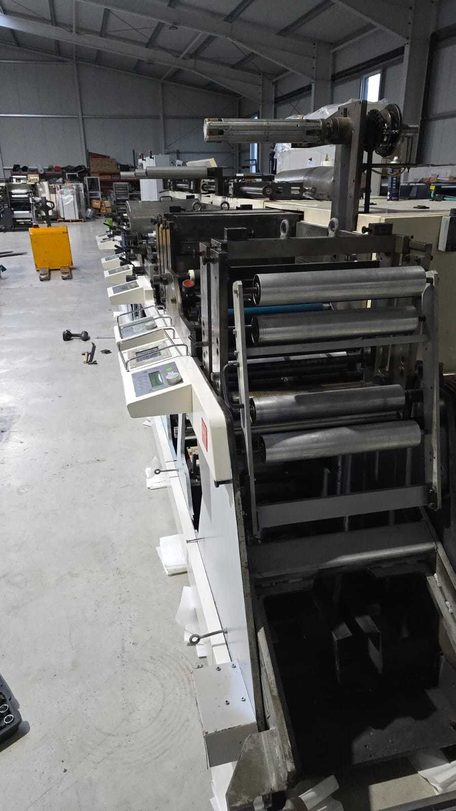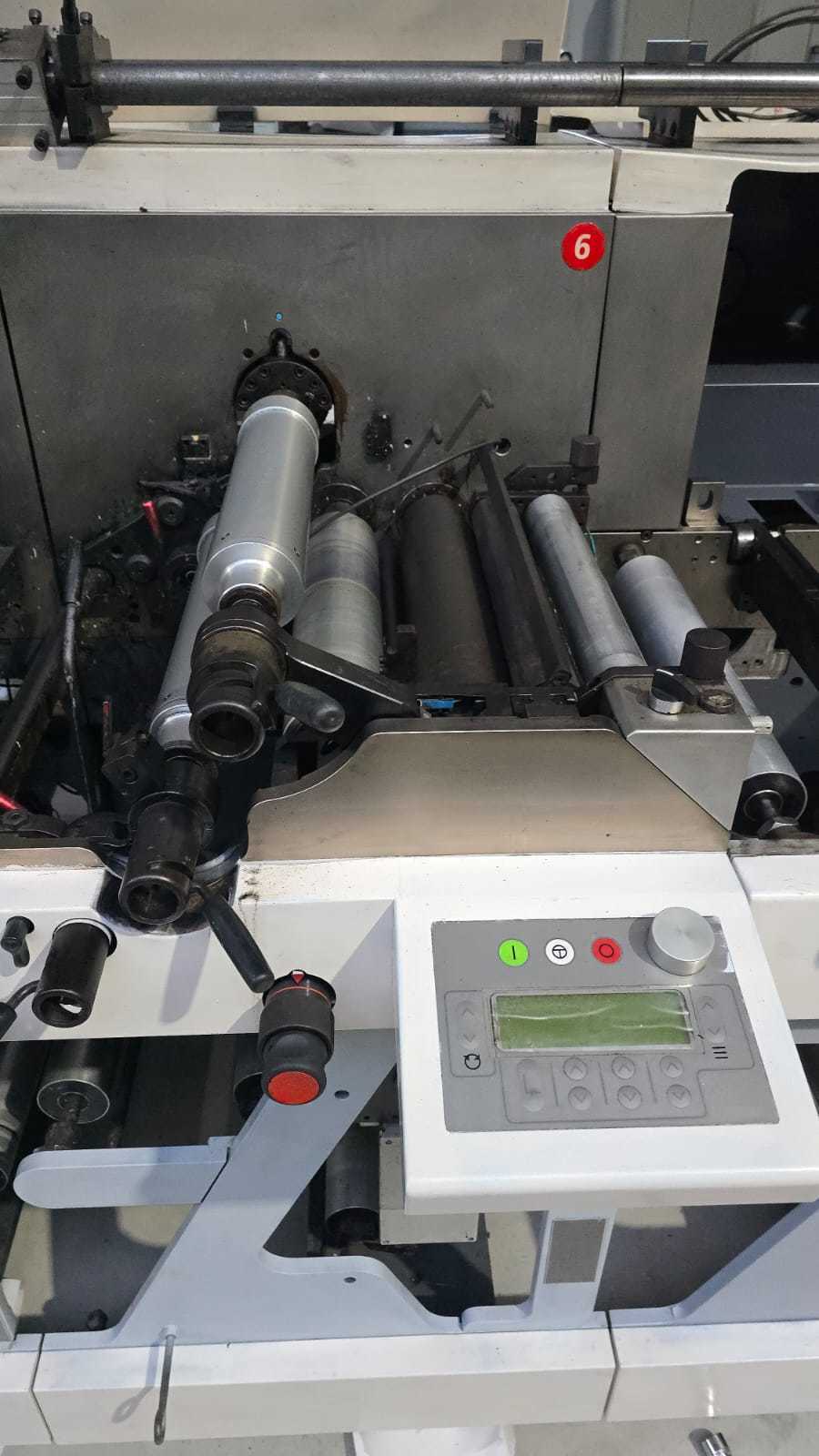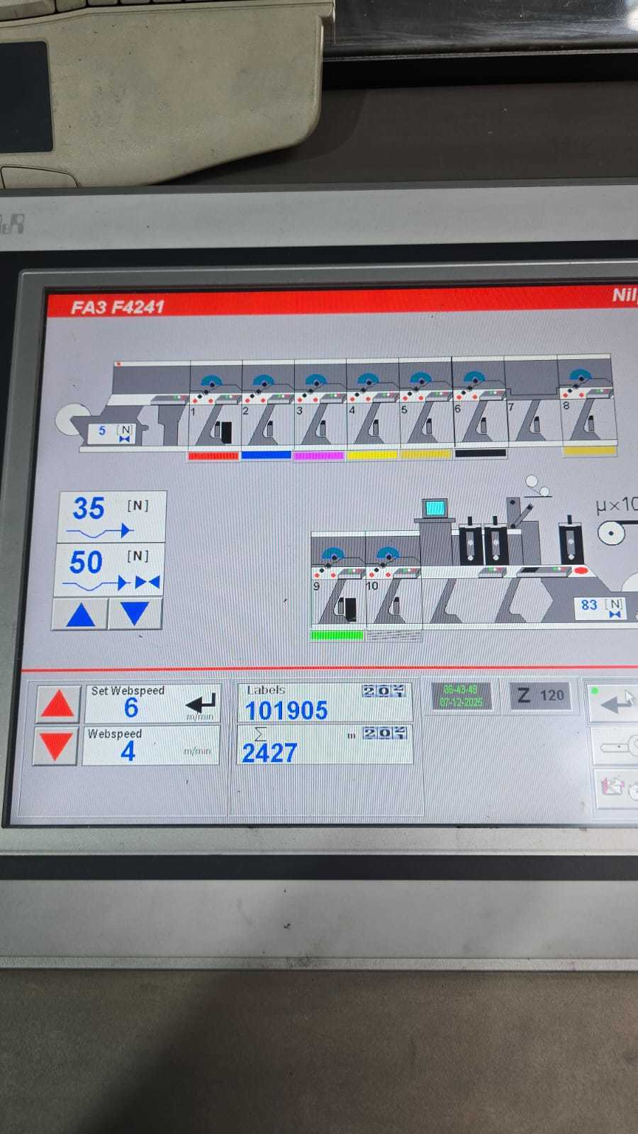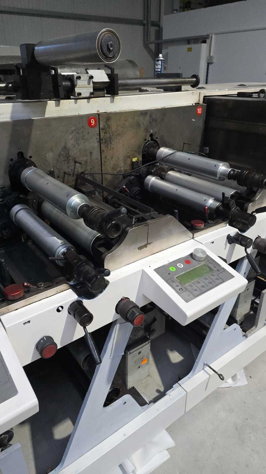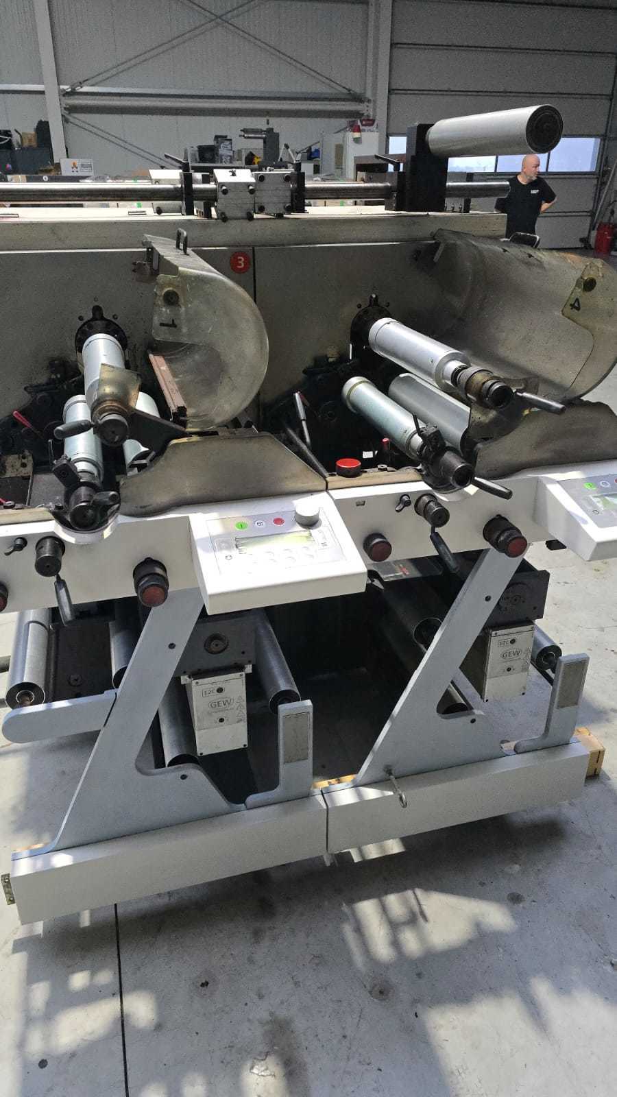 INFEED MODULE<>Rail-system<>2 Cold- Foil<>UV Lamination<>Sheeting unit<>2 Screen unit<>Print Sleeves 103<>Anilox 40<>Magnetic 10<>Corona treater<>Web cleaner<>Turn bar<>Delam / relam