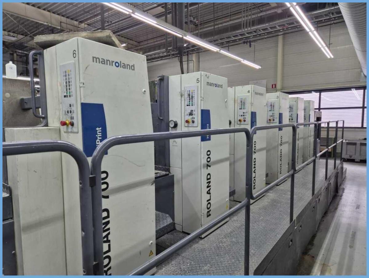 New style feeder<>Elettra Programmable blanket/roller/imp. cylinder wash<>Automatic lateral pile adjustment<>Becker VariAir<>Atlas Copco GA5 compressor<>Roland Select IR / TL dryer<>Roland Select Combistar Beta C combined refrig/ink temp control<>Grafix Cantronic 3000 Powder Spray with HEP<>ROLAND DELTAMATIC dampening system<>CCI colour regulation<>Color Pilot<>APL automated plate loading (full automatic)<>Preset - automatic size device<>ionizer in the feeder<>Steelplate in feeder and delivery<>Coater<>Anilox rollers<>Extended Delivery