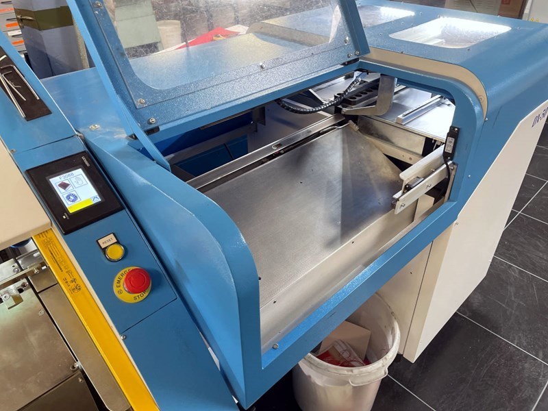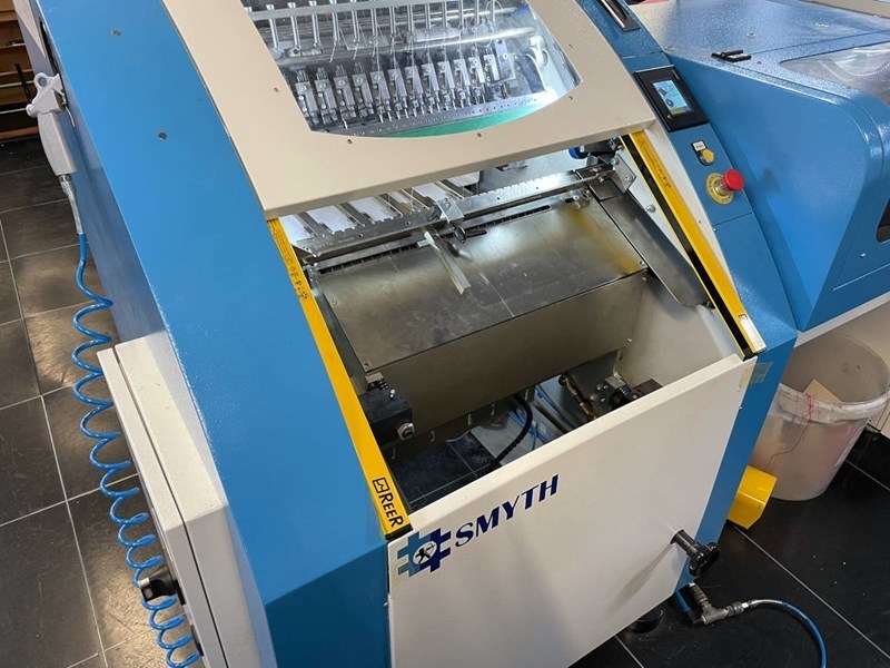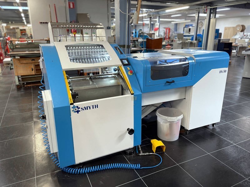 The DX-50 produces digitally-printed sewn books composed of 4-page inserted signatures<>• One single operator<>Entire production process handled by one single operator.<>• Easy handling<>No special training or expertise required<>• Fast format changeover times<>Simple straightforward machine set-up time in 5 minutes<>• Modular<>Folding unit can be integrated at a later date<>• On-demand books<>Ideally suited to digitally printed short-to-micro runs<>Inserter<>The sheets are printed in sequence and then manually loaded into the feed tray by the operator. The sheets are aligned on both sides and transported to the collecting station where the cross knife unit folds the sheets by means of its vertical movement from bottom to top.<>Collecting and folding station<>The knife-scored and folded signature is transferred inside two facing, pneumatically-driven plates that press the fold. Subsequently, the signature is transferred from these plates to the fix saddle of the sewing machine.<>FX-50 thread book sewing machine<>Ideal for on-demand books, the sewing machine is also suitable for oversized book production because of its capacity to deal with signatures up to 510 x 550 mm (front feeding) and 510 x 350 mm (side feeding). The sewing unit can also be employed more traditionally as an off line machine.