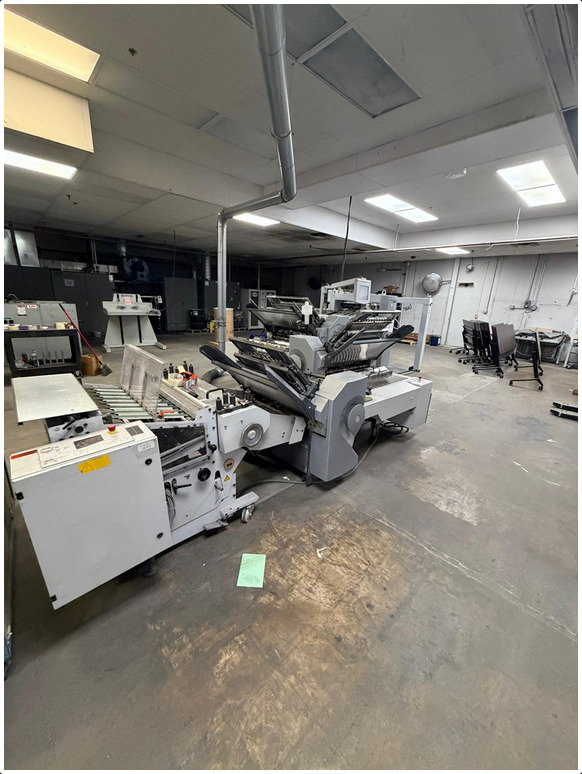 • Digital microprocessor control with self-learning function for signature length & spacing with run<>monitoring, total and batch counter with memory.<>• Touchscreen for fully automatic setting of fold plates and roller pressures.<>• Combination buckle plates with swing-away deflectors for quick change from stop to fold.<>• Setting adjustments can be made outside the machine ‘on the fly’.<>• VSA 56 vertical stacking delivery.<>Including compressor, tools, spares & manuals.<>Folding sequence:<>1st buckle unit – 82cm with 4 plates, perforating/scoring shafts<>2nd mobile buckle unit – 66cm with 4 plates, perforating/scoring shafts<>3rd mobile buckle unit – 52cm with 4 plates, perforating/scoring shafts<>Gate fold attachment